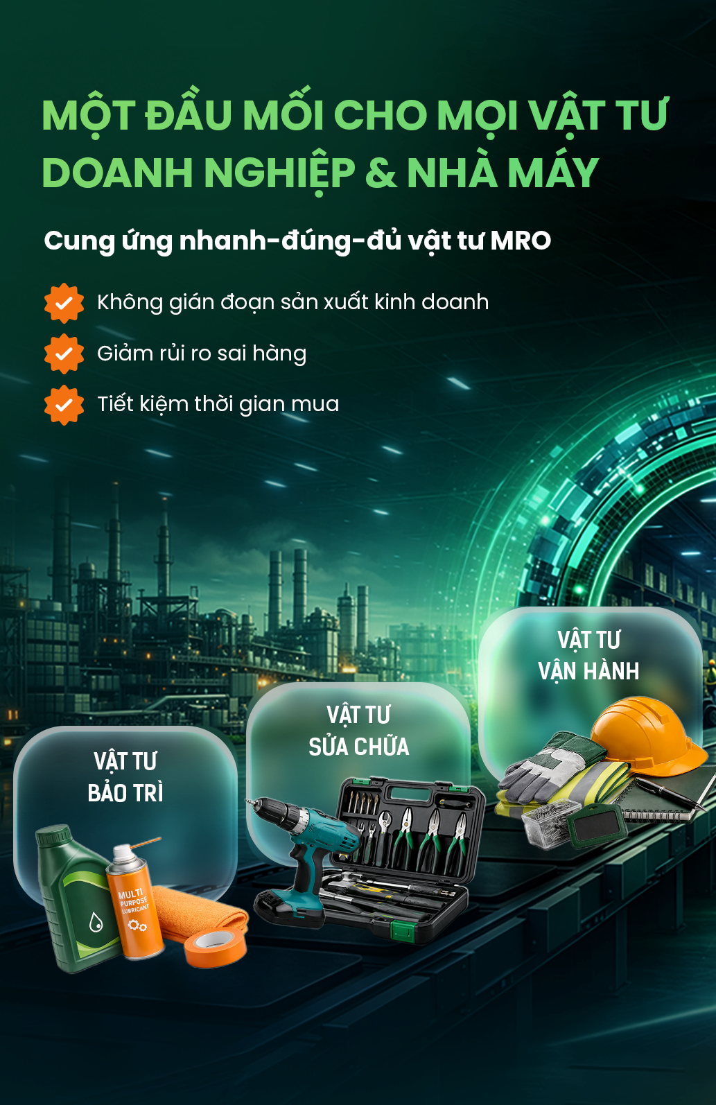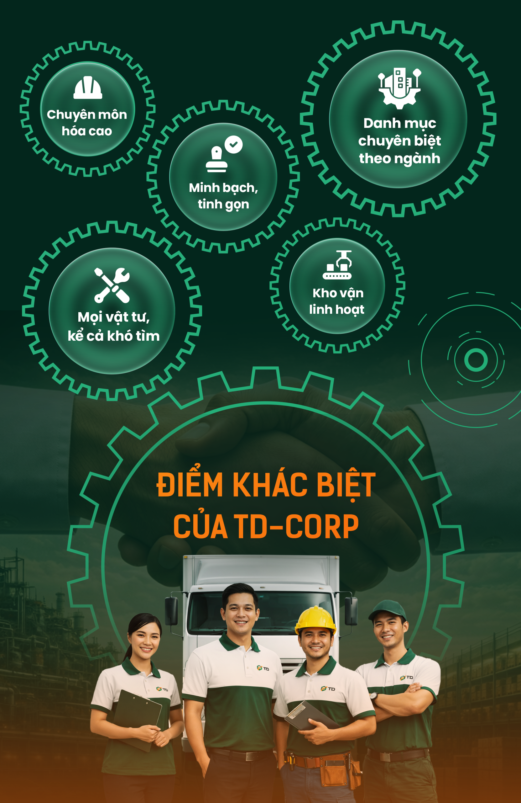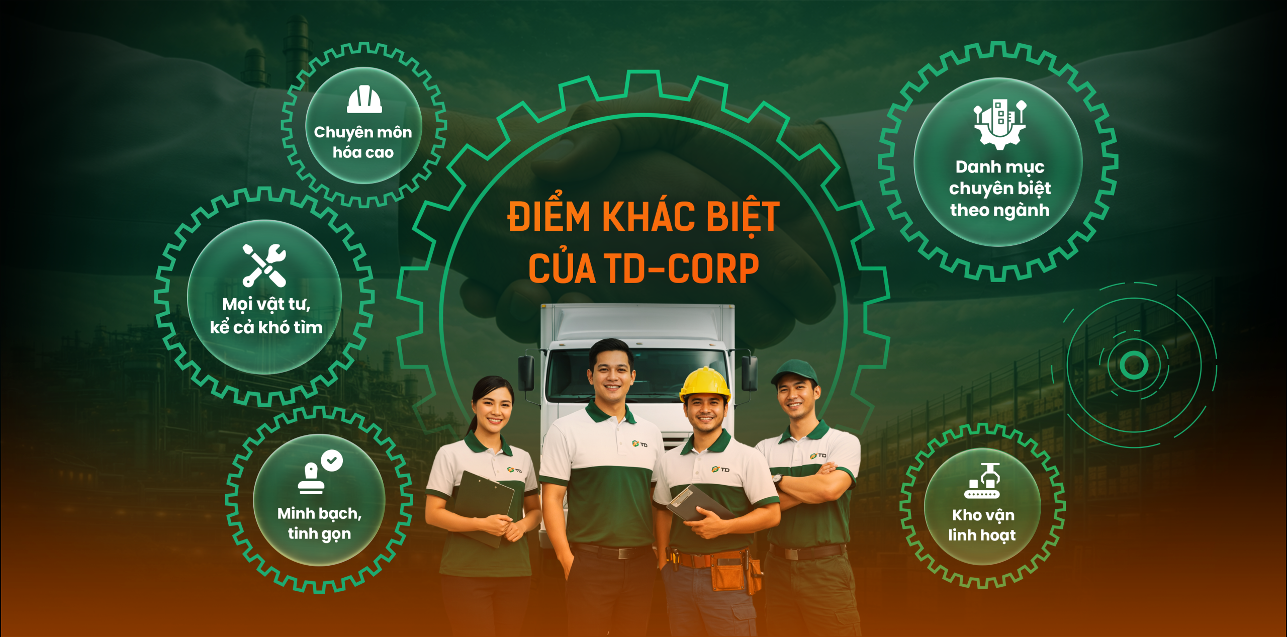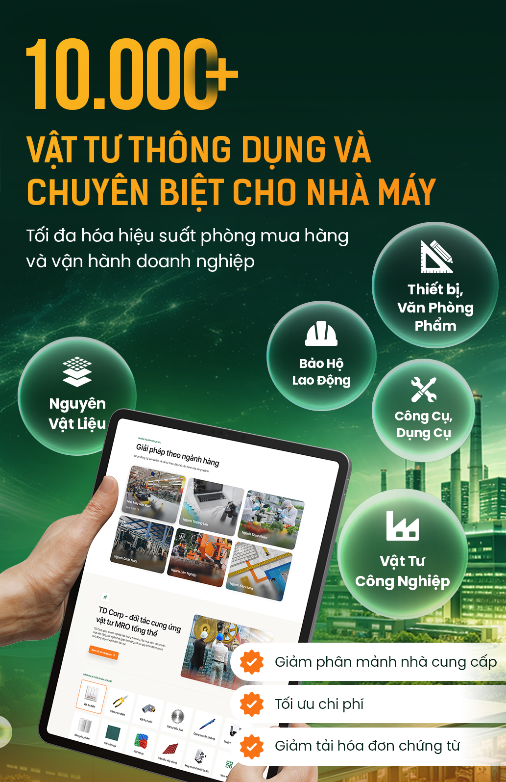 Đáp ứng nhu cầu vật tư từ sản xuất đến vận hành, TD Corp giúp doanh nghiệp tập trung hóa nhu cầu mua sắm, tinh gọn quy trình và chuỗi cung ứng, triệt tiêu chi phí ẩn, đảm bảo nhà máy vận hành ổn định liên tục trước biến động
