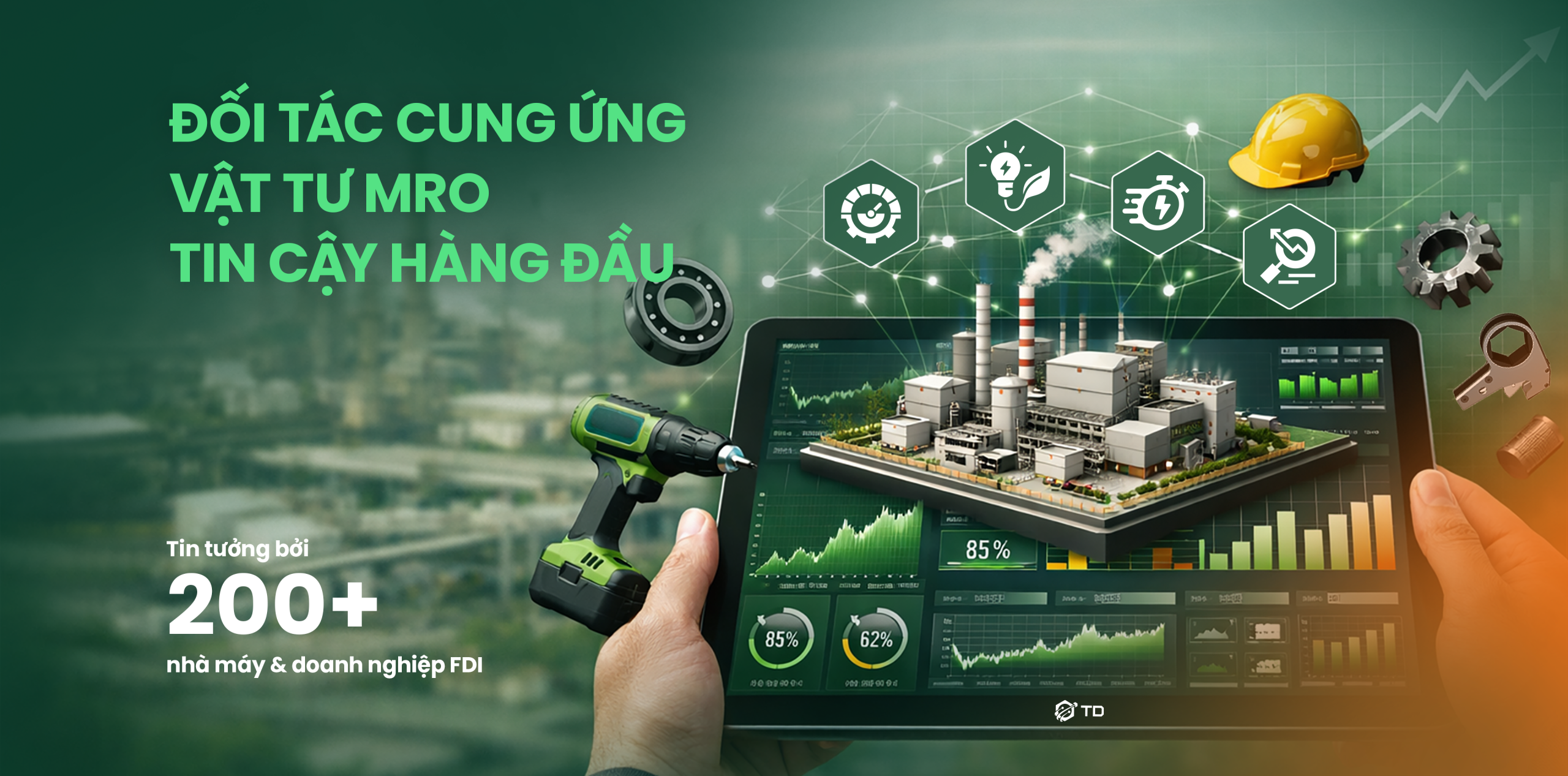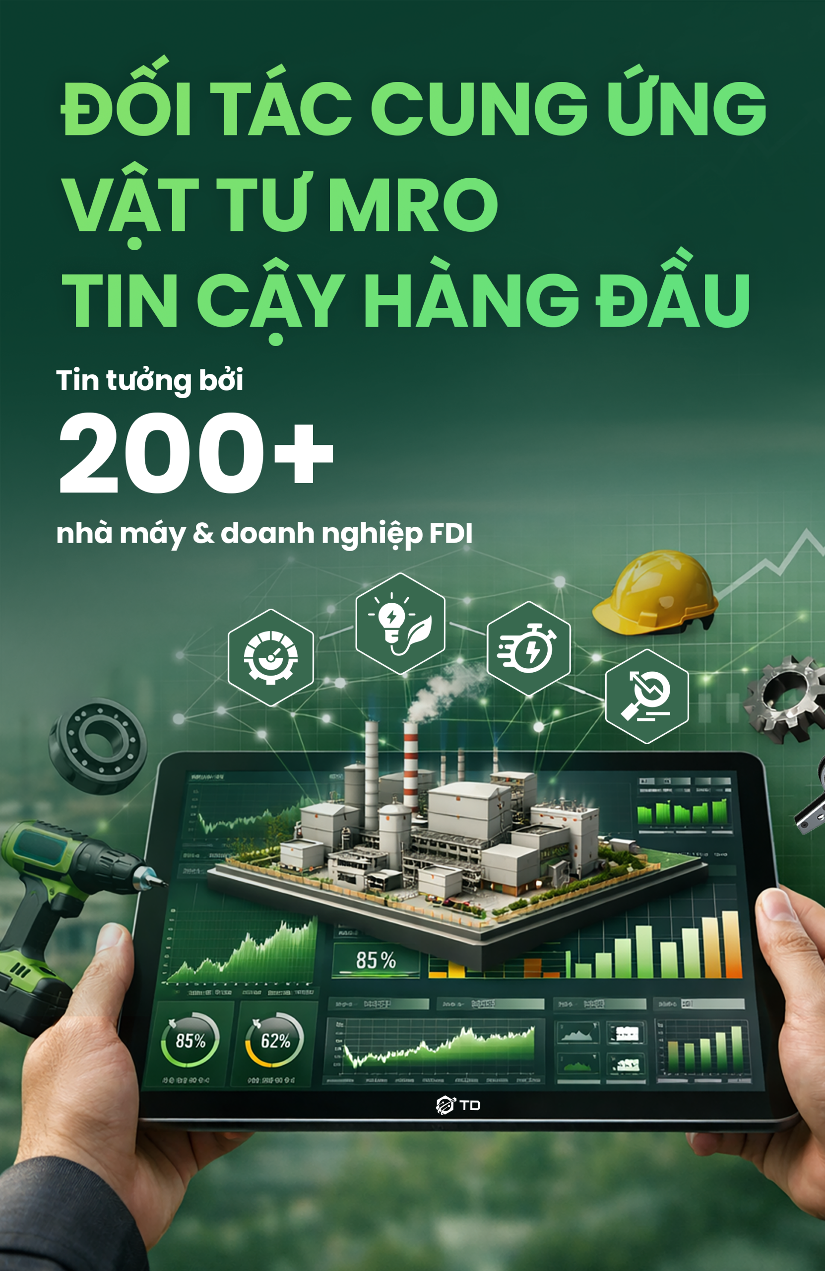Hơn cả nhà cung cấp thông thường, TD là đối tác chiến lược giúp doanh nghiệp sản xuất tối ưu chuỗi cung ứng bằng các bộ giải pháp vật tư MRO chuyên biệt cho từng ngành hàng.